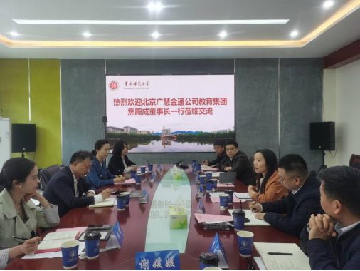 北京广慧金通教育集团副总经理兼教学管理部总经理李青谦系统介绍了集团着力兴办教育、培育教学研究成果、建设现代产业学院等情况。焦殿成董事长在讲话中对合作以来校方给予的大力支持表示感谢,希望双方在合作共赢的基础上,进一步深化校企合作,谋求长远发展,推动产业专业建设行稳致远。