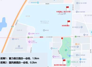 重庆富力假日酒店(重庆市高新区大学城南路26号)(单间、标间390元/晚;豪华单间470元/晚);蘑菇视频 国风楼酒店(单间、标间268元/晚)。会务组可根据注册情况统一办理酒店预定。会议期间,会务组将安排车辆统一接送入住在重庆富力假日酒店的参会者。