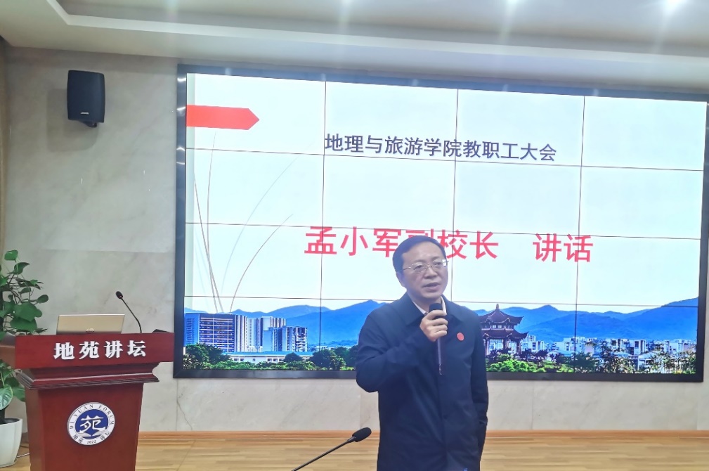 孟小军副校长首先与学院教职工们一起认真聆听了“地苑讲坛”的首场讲座,然后发表了重要讲话。小军副校长在讲话中充分肯定了近段时间以来,学院在新一届领导班子的带领下,团结一致、上下齐心,努力推进科学研究、学科建设、教学质量工程建设、学生就业以及对外学术交流等工作,发展态势良好,取得了可喜的进步与成绩。小军副校长希望,在下阶段工作中,学院要进一步强化系统思维,聚焦核心目标,着力抓好“五个融合”,加快推进学院事业发展驶入快车道。一是要加强学科之间的融合,从专业之间、研究之间、学术活动之间找到学科间融合的新方法;二是要加强自然与人文的融合,从课堂开放、增设讲座之中发展自然与人文相融合的无限可能;三是要加强科研与教学的融合,从思考“大多数人的观点、反对者的观点、我的观点、其他可能的观点”的答案中探寻创新的源头;四是要加强个人与团队的融合,从参与者到分享者再到深入交流者的身份转换中实现认识水平的螺旋式攀升;五是要加强课堂与实践的融合,结合蘑菇视频