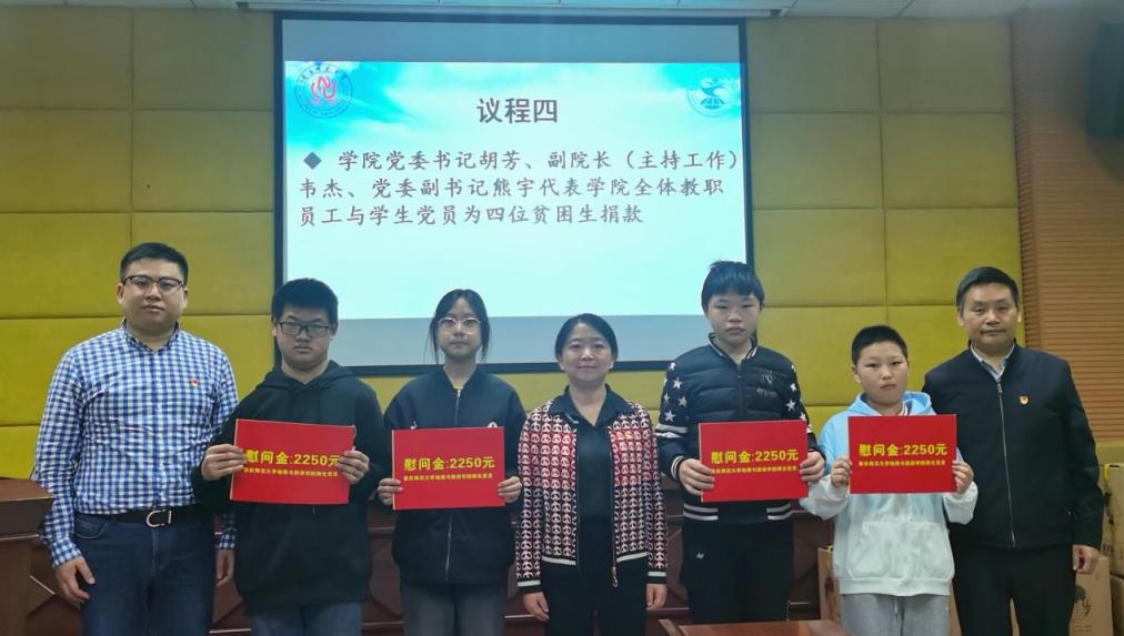 (学院党委领导代表学院全体教职工与学生党员为4名贫困生捐款)