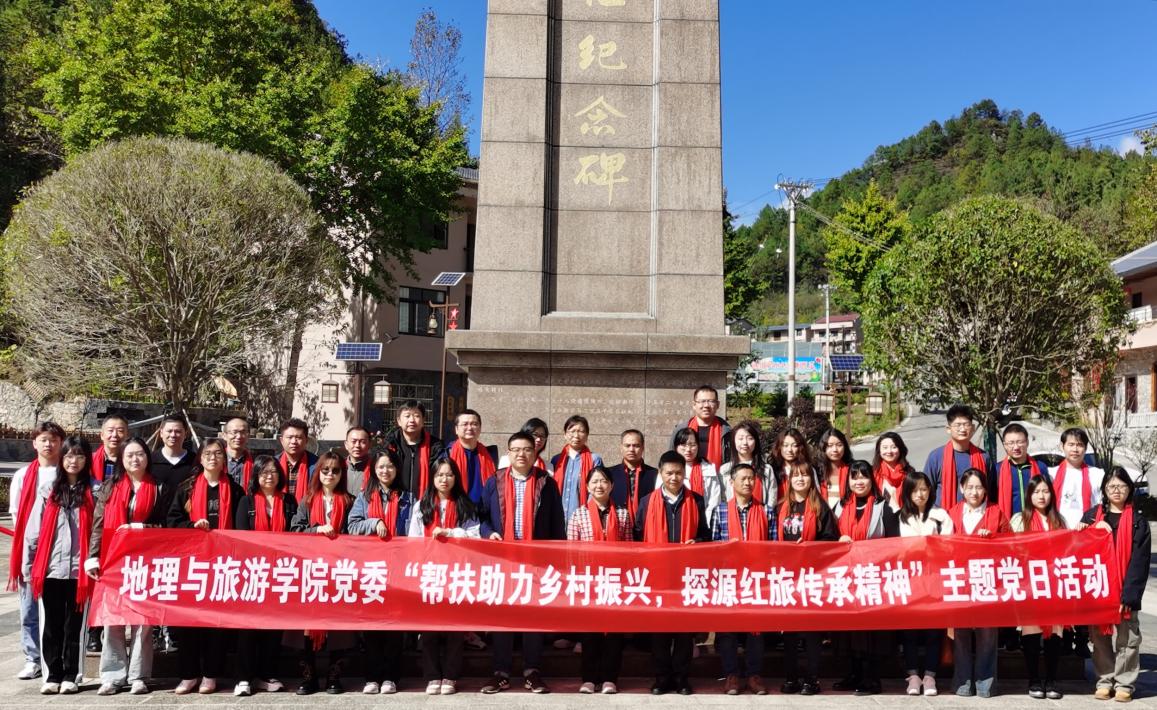 党员师生在红三军小长征纪念碑前合影)