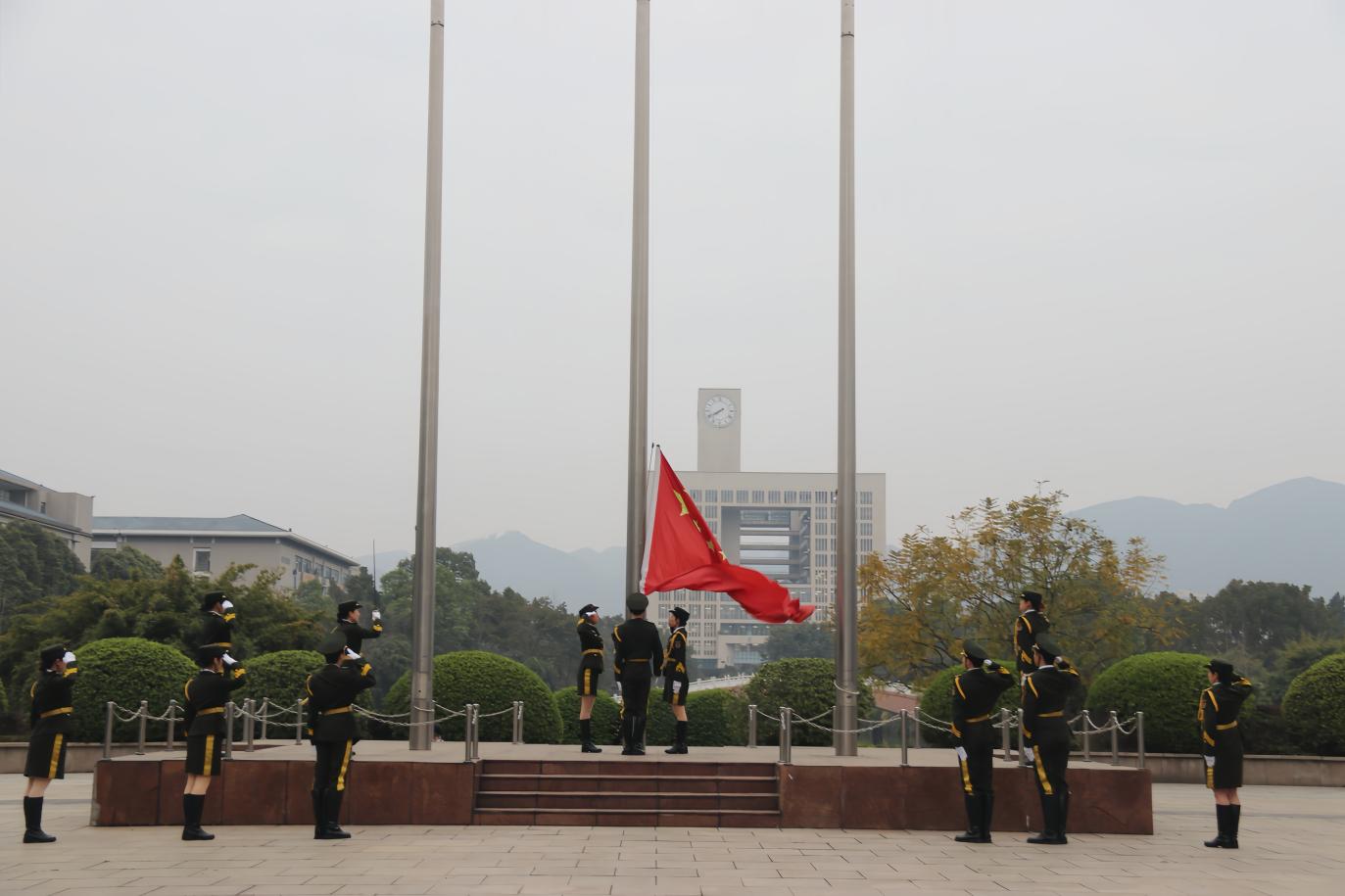 7点40分,学院全体师生已整齐列队。护旗手以坚定的步伐护送着国旗步入场地,随着激昂雄壮的《义勇军进行曲》响起,五星红旗徐徐升空,迎风展扬。全体师生庄严肃立,齐声高唱国歌,向国旗致以崇高的敬意。