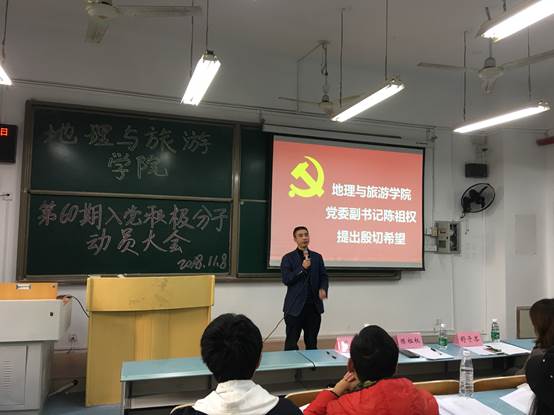 于2018年11月8日在弘德楼15101组织召开第60期入党积极分子动员大会。参加此次会议的人有党委副书记陈祖权老师、团总支书记瞿聪老师、辅导员舒子芩老师、马列部工作人员和本期入党积极分子共计100余人。