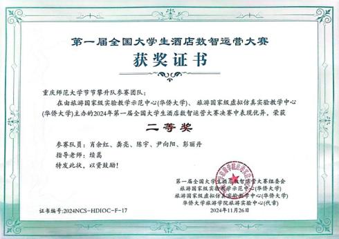 酒店管理专业“节节攀升队”凭借出色的表现,在入围决赛的27支高校团队中,荣获大赛二等奖,展现了卓越的数智化酒店运营能力和团队协作精神。