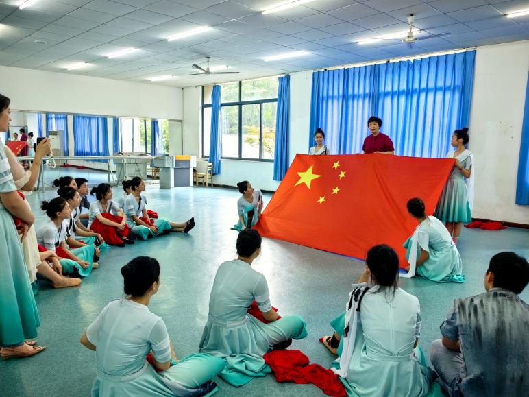 著名歌唱家、国家一级演员张礼慧教授亲临排练厅,作为歌剧《江姐》江姐的扮演者,为同学们分享自己对人物的感受,讲解江岩中江姐绣红旗的故事,通过张教授的娓娓道来,同学们对绣红旗的历史背景理解更加深刻。张教授还和同学们一起深情合唱了《绣红旗》,与同学们交流互动,一针一线地绣起红旗引导同学们的情绪,让大家仿佛亲临了历史场景之中,深切体会革命者们对新中国的向往。