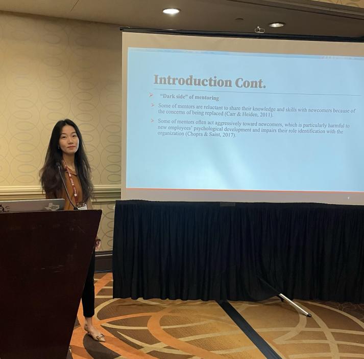 教师周小曼博士在“组织行为学——领导力研究”分论坛做了题为“How mentors inspire affective commitment in newcomers: The roles of servant leadership, psychological capital, and feedback seeking behavior”的学术报告。本次报告主要研究探讨了服务型领导和导师的双重角色对酒店新员工情感承诺的多路径影响,并揭示了员工反馈寻求行为对导师的服务型领导与员工心理资本之间关系的调节作用。研究成果为服务业吸引、管理、留任新生代员工,提升其职业承诺,并从组织社会化制度设计视角规避师徒制潜在的“黑暗面”提出管理启示。在通过AOM三位外审专家审稿意见的指导与现场学者的建议下,该论文已投稿至SSCI顶刊。