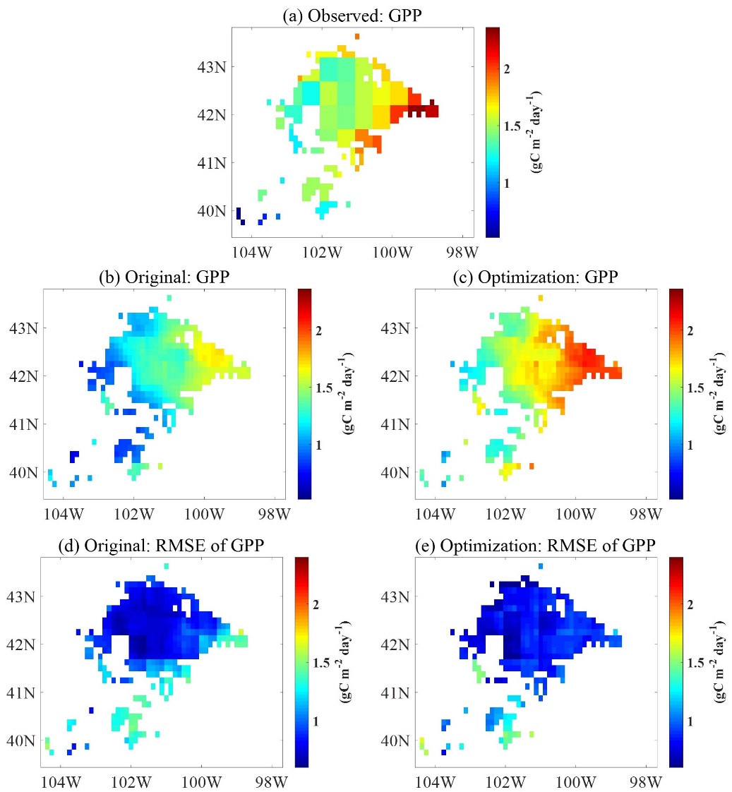 图2.总初级生产力模拟的空间比较: (a)观测值, (b)默认值, (c)优化值, (d)默认参数下总初级生产力的RMSE, 以及(e)优化参数下总初级生产力的RMSE.