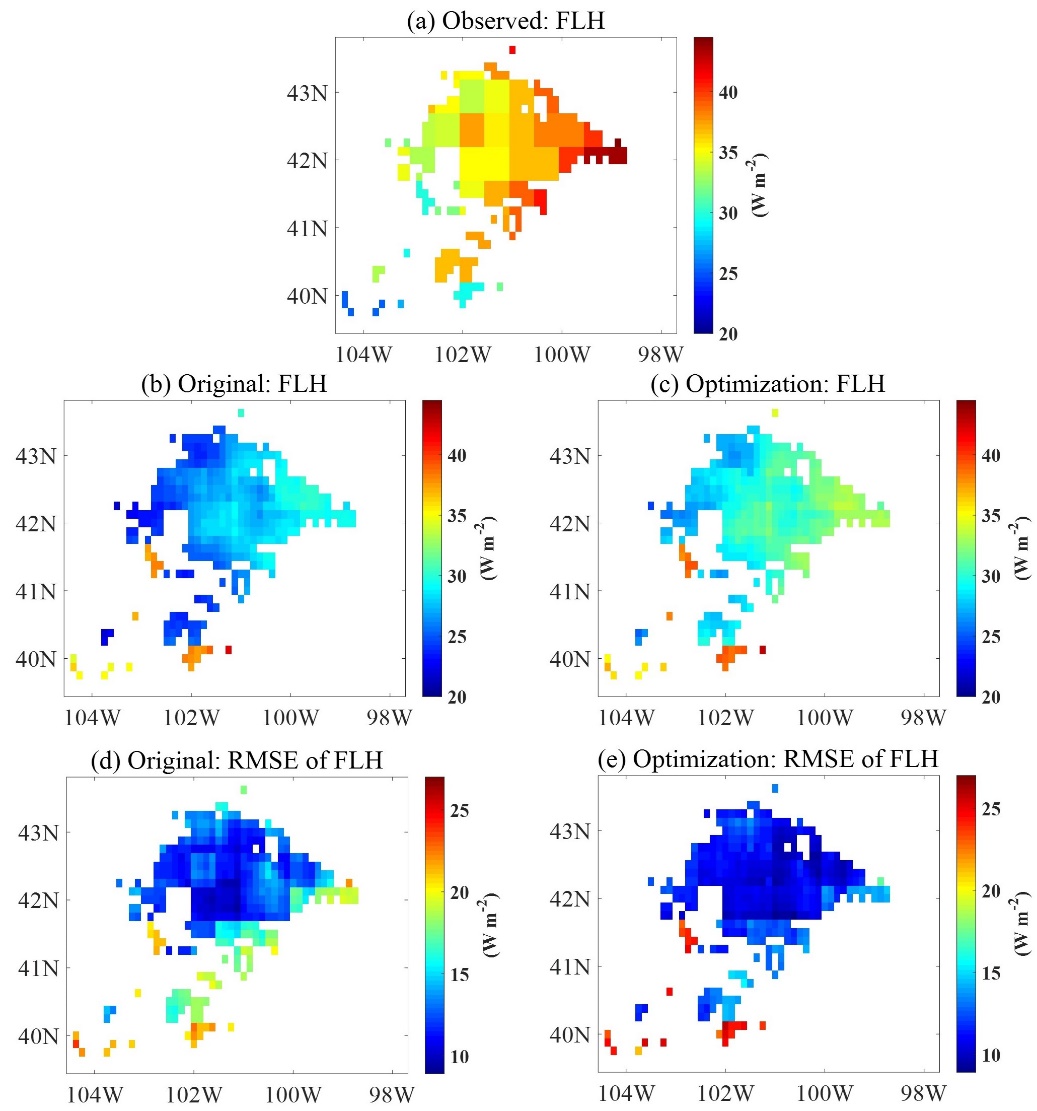 图1.潜热通量模拟的空间比较: (a)观测值, (b)默认值, (c)优化值, (d)默认参数下潜热通量的RMSE, 以及(e)优化参数下潜热通量的RMSE.