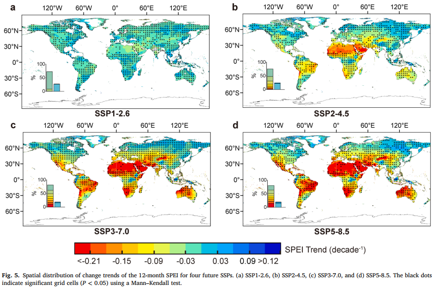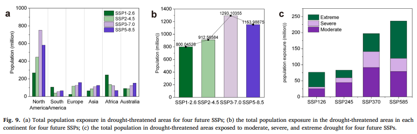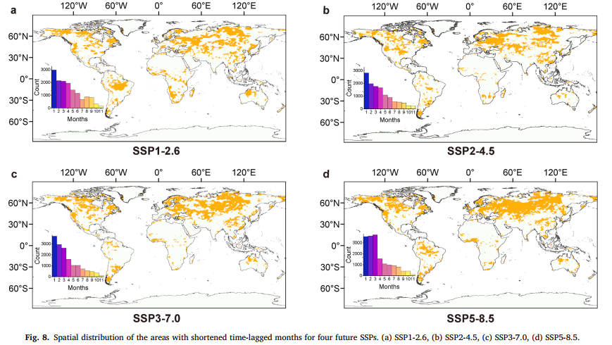 同时,以干旱对植被生长滞后时间的缩短为切入点,描述了未来不同发展情境全球干旱发生的危险以及由此产生的社会-经济威胁。结果表明,到21世纪末,全球干旱事件的持续时间、频率和影响规模将显著增加,且湿润趋势也将加强,洪水将频繁发生。28.3%、24.7%、30.4%和35%的全球土地在四种SSP-RCP情况下显示出时间滞后月份的下降,即植被生长对干旱的敏感性增强,对应的有94138、976020、526595和2047280亿美元及近80亿、91亿、129亿和115亿人口将受到持续干旱的威胁。