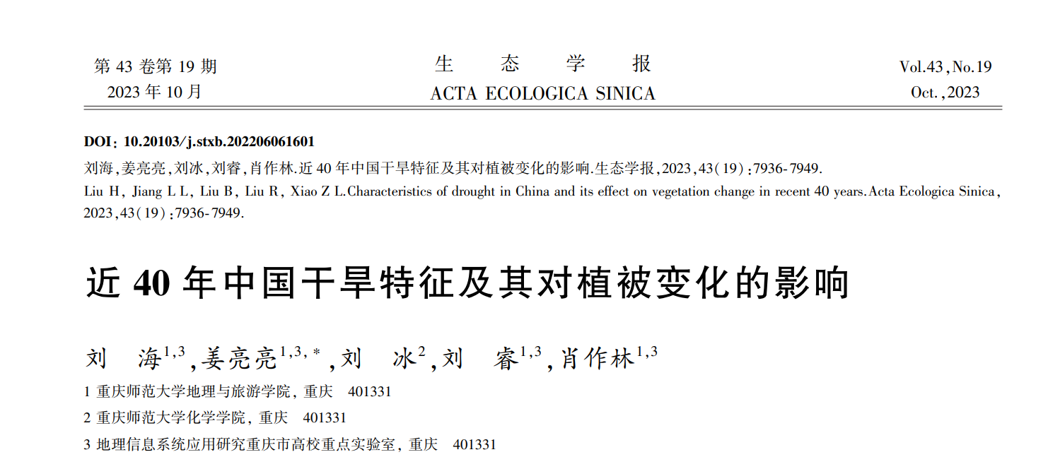地图学与地理信息系统专业研究生刘海基于GLASS数据产品、ERA5-LanD数据,采用游程理论和多元线性回归等方法,探究了1982-2018年间多尺度干旱事件基本特征(干旱持续时间、干旱严重度、干旱强度等),并分析植被生产力变化趋势,以揭示干旱对植被变化的累积影响。研究成果以“近40年中国干旱特征及其队植被变化的影响”为题发表在《生态学报》上。研究生刘海为第一作者,姜亮亮副教授为通讯作者。
