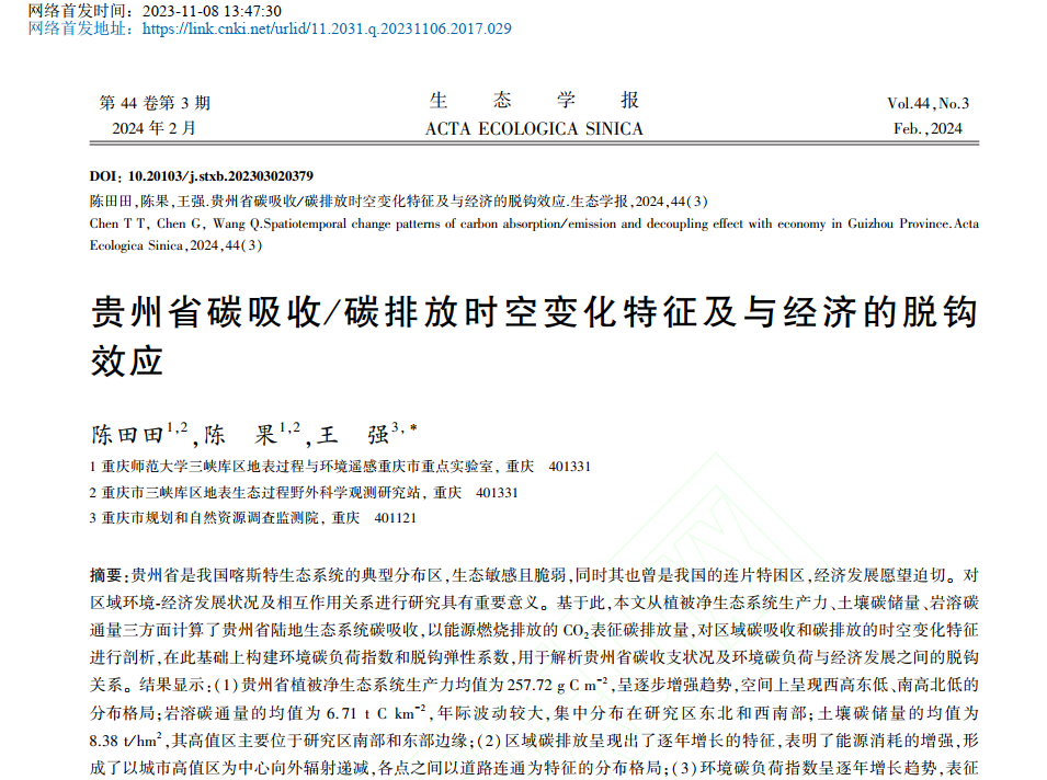 相关研究成果以题为《贵州省碳吸收/碳排放时空变化特征及与经济的脱钩效应》发表在国内生态学顶级期刊《生态学报》。陈田田副教授为第一作者,王强工程师为通讯作者,蘑菇视频 三峡库区地表过程与环境遥感重庆市重点实验室为第一单位。该项研究工作得到国家自然科学青年基金(42001090)等项目支持。