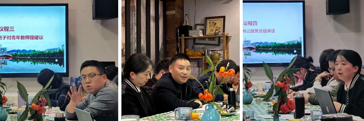 随后,青年教师就身份转换、教师成长、科研工作、课程教学、学生工作、行政工作等方面的问题、困扰、经验、方法等进行了深入的沟通和交流。面对新的角色身份,如何完成转变,如何应对时间碎片化的问题,青年教师们表示大多存在此类困惑;面对接踵而至的学生工作、行政工作,如何调整心态,化繁琐为有序,老师们畅谈了个人经验及看法;面对教师成长,如何达到科研与教学,工作与生活的平衡,筑牢理想信念,保持初心与使命,老师们也进行了充分的沟通与探讨。