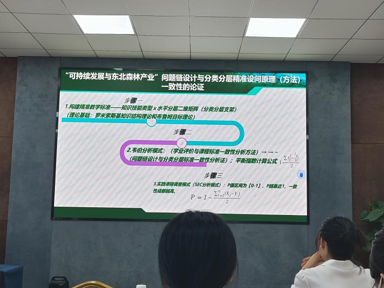 最后,李琳教授以“可持续发展与东北森林产业”为例,向师生们展示了如何运用分类分层精准设问法进行丰富的、有层次的设问,并在最后还分享了问题链设计与分类分层精准设问原理之间一致性检验的步骤。
