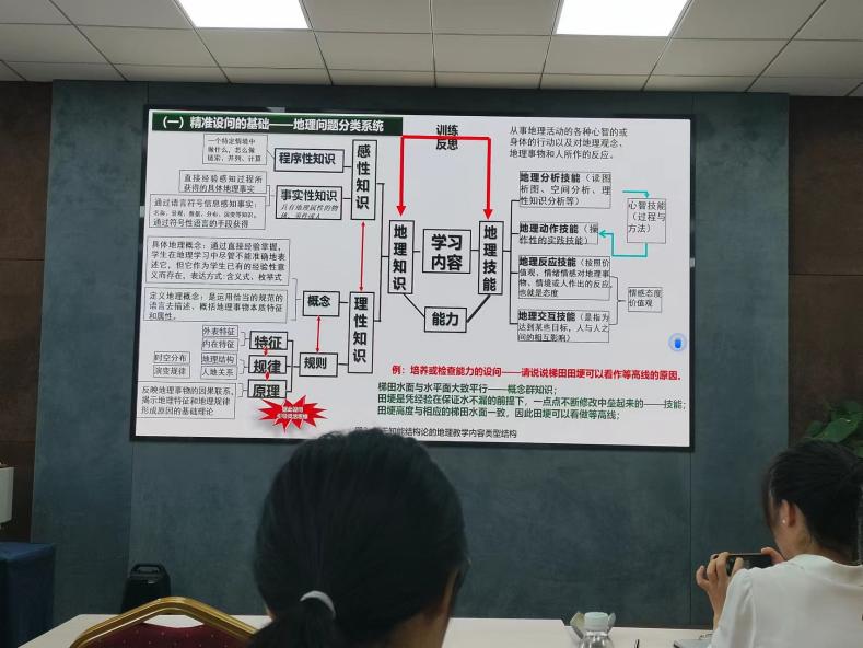 在讲座中,李琳教授首先辨析了教学原理与教学理论、教学模式、教学方法、教学理念之间的差异,通过图示详细解释了精准教学的内涵并提出了分类分层法在精准教学中的优势,让在座师生对精准教学有了更为深刻的理解。接着,李琳教授通过生动的案例和丰富的实践经验向大家分享了地理问题分类系统,使在座师生们对地理知识、地理技能、情感态度价值观之间的关系有了更深刻的理解。