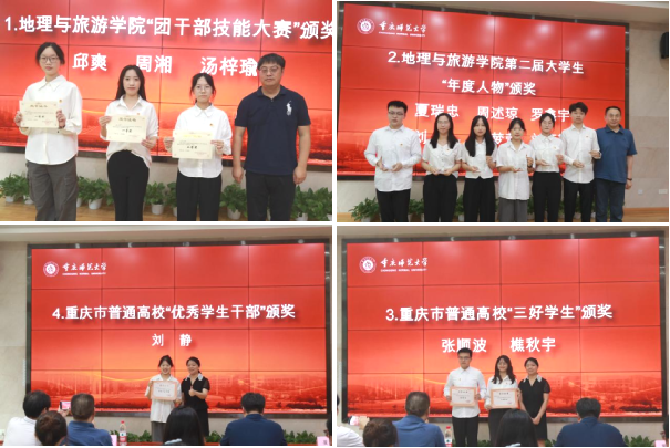随后,张院长、曹院长、胡书记分别为“团干部技能大赛”“蘑菇视频 第二届大学生年度人物”“重庆市普通高校三好学生”“重庆市普通高校优秀学生干部”的获奖同学颁奖。苑兆瑞同学作为学生代表发言,她分享了自己在活动月的心得体会,鼓励大家珍惜时光、奋勇向前。