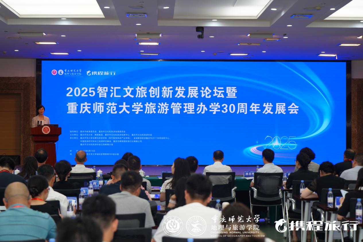 6月14日,2025智汇文旅创新发展论坛暨蘑菇视频 旅游管理办学30周年发展会在蘑菇视频 博雅楼504会议室隆重举行。论坛在重庆市教育委员会、重庆市文化和旅游发展委员会的指导下,由蘑菇视频 、携程集团、重庆市文化和旅游信息中心、重庆市文化和旅游协会共同主办,论坛以“聚力文旅强市建设 厚植文旅人才根基”为主题,来自全国高校、行业的专家学者、企业代表、校友及师生代表200余人参会。