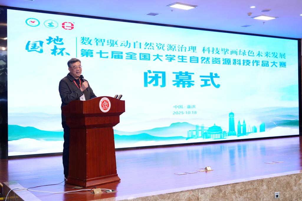 闭幕式由中国自然资源学会副秘书长王捷主持大赛评审组副组长、西南大学涂建军教授在综合点评中指出,本届参赛作品整体呈现出“数智化”程度高、交叉性强、应用前景广的特点,充分肯定了各团队对大赛主题的深刻理解和卓越实践,并向获得各项大奖的老师同学们表示祝贺。