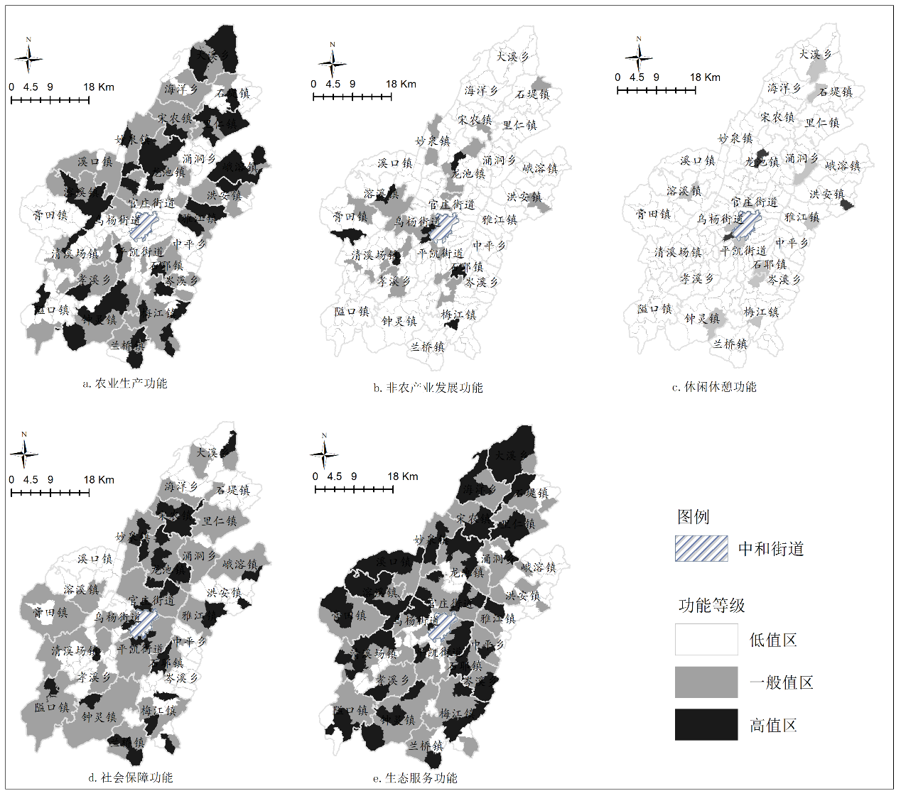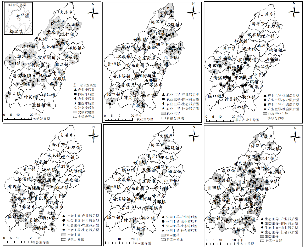 结果表明:(1)秀山县5大乡村地域功能强弱及其空间分布存在一定差异,其中农业生产功能和社会保障功能整体较强,由东北向西南减弱;非农产业发展功能整体较弱,东北弱西南强;休闲休憩功能整体较弱,空间布局没有明显分异特征;生态服务功能整体较强,西北强东南弱。(2)秀山县乡村地域发展类型识别结果为综合发展型1个、欠缺发展型62个、极化发展型193个,未见主导发展型和均衡发展型,未来以“抓重点、补短板、强弱项”为指导思想,以“以强扶弱”为辅助手段,抓住发展重点,明确乡村发展方向,走差异化乡村振兴战略。(3)秀山县虽实现脱贫摘帽,但乡村发展整体处于初级阶段。[结论]秀山县整体经济欠发达,各类功能发展不均衡,尤其非农产业发展功能和休闲休憩功能发展任重而道远,非农产业结构层次低,旅游资源需加大盘活力度,促进将来乡村转型、乡村发展以及乡村振兴。