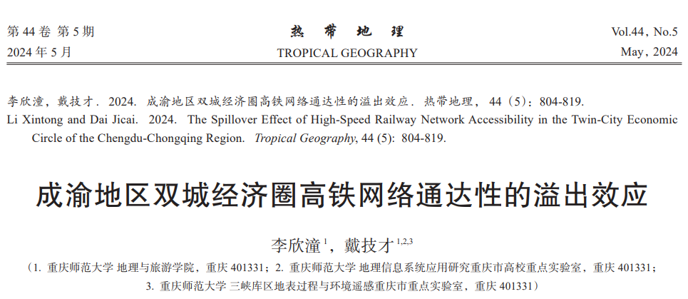 人文地理学专业研究生李欣潼以成渝地区双城经济圈高铁网络为研究对象,基于最短出行时间、加权平均出行时间、日常通达性指数、引力模型和空间杜宾模型,探讨了高铁网络通达格局演化与其产生的溢出效应。研究成果以“成渝地区双城经济圈高铁网络通达性的溢出效应”为题发表在《热带地理》。GIS应用创新团队研究生李欣潼为第一作者,戴技才老师为通讯作者。