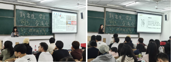 国家奖学金获得者,2022级的贾艺坤和席宁哲两位师姐分享了学术研究的方法和技巧,现场为新生答疑解惑。2019级的胡明师姐及荣获重庆市三好学生、优秀毕业生称号的2021级的王钰茜师姐通过视频分享了她们在研究生期间的成长历程与学术研究成果,建议同学们要清晰认识自己和外部环境,尽早制定切实可行的研究生阶段规划,为未来的学术道路奠定坚实基础。