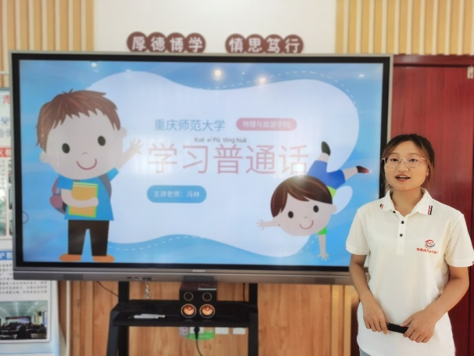 7月28日,推普第一课在幼儿园到四年级的孩子中进行,服务团成员冯林以“什么是普通话”为题展开教学,与小朋友们一起拼读生字生词,并以《彩色的中国》为主要教学文本,鼓励大家在课堂中大声朗读出来,不仅让孩子们在朗读中感受音韵之美,也对树立正确的价值观有着潜移默化的影响。同时,团队成员还通过绕口令、唱歌等形式,利用节奏感强、朗朗上口的诗词进一步加强活动的互动性。在服务团各成员的尽心教学下,小朋友们学习热情高涨,在课堂上积极举手发言,朗读声抑扬顿挫,有效引导他们学好、讲好、用好普通话。