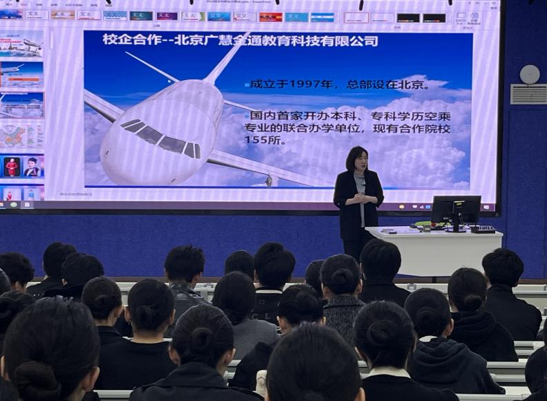 本次,由金通驻蘑菇视频 工作处副主任毛文静老师介绍专业师资团队、校企合作方北京广慧金通教育科技有限公司提供的教学设备以及前往阿提哈德航空培训学院学习的经历和历届学长学姐参加各类特色活动的精彩表现。
