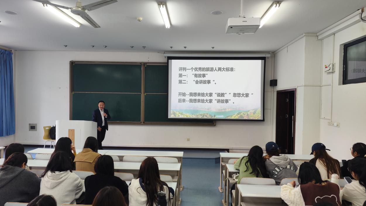 行业导师,也是重庆旅游界知名的专业经理人,为国家金牌导游、重庆市导游协会副会长、重庆三峡文化导游大师工作室负责人。王总从自身成长经历出发,阐释了出身草根不是制约因素的道理,引导鼓励同学们要努力上进,创造辉煌;通过风趣幽默的职场故事,阐明了从事旅游行业必须秉承坚持不懈的理念;通过自身丰富的旅游经历,告诉同学们“做好旅游者是做好旅游人的基础”、“旅游人要有工匠精神”、“旅游人要用情怀做好每件事情”等诸多道理。王总根治三峡游轮行业,精通三峡文化,展现出了旅游人深厚文化积淀,也给学生深深的启示。