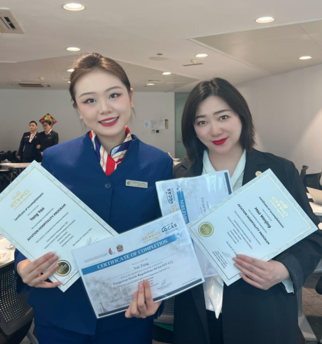 航空服务艺术与管理专业的专业教师毛文静同21级航空服务艺术与管理专业学生汤垚于阿提哈德航空公司培训结束,圆满完成了北京广慧金通教育集团资助的为期42天的“国际交流联合培养航空人才项目。