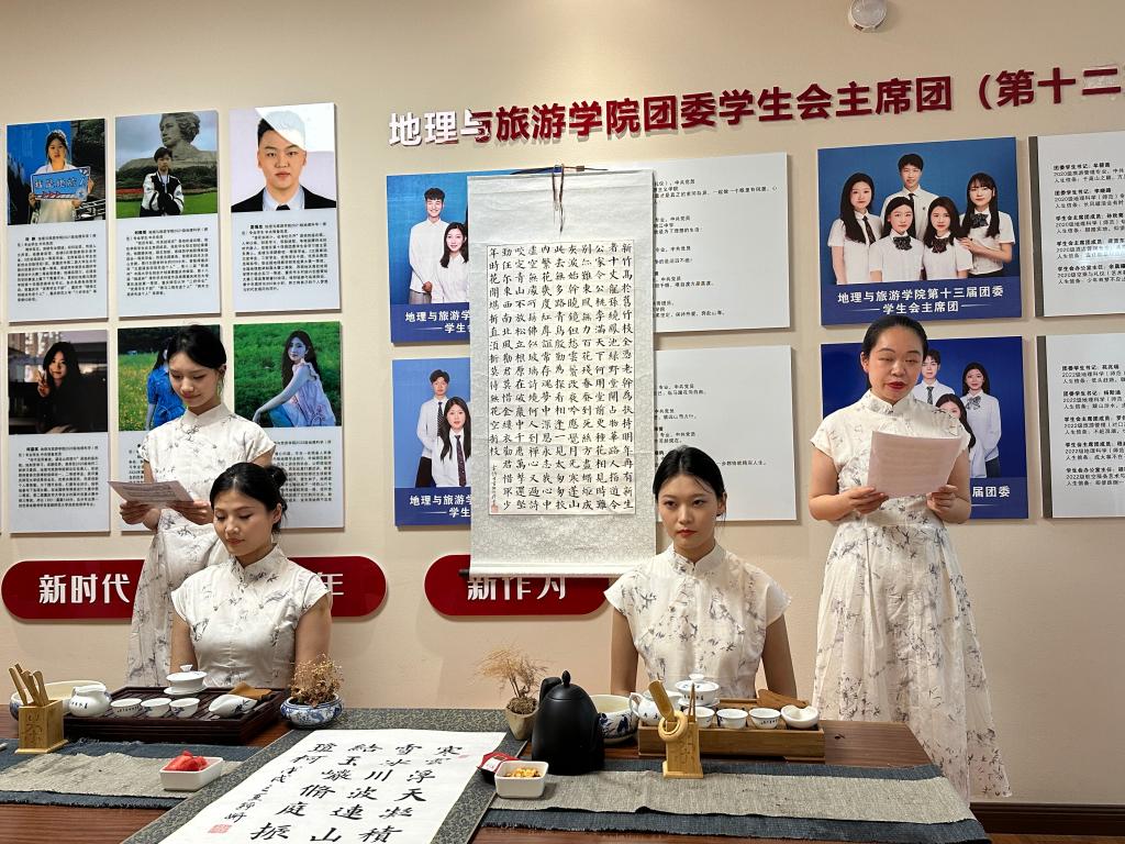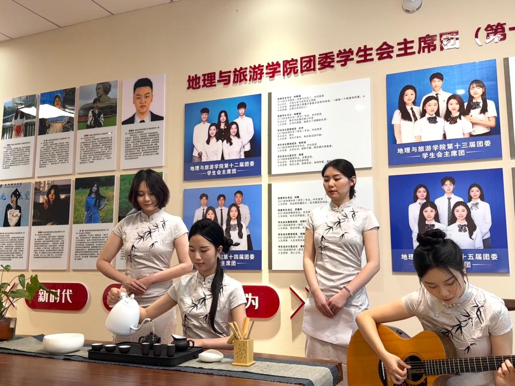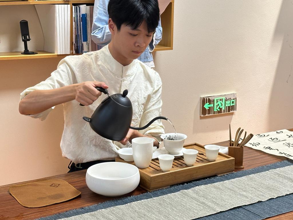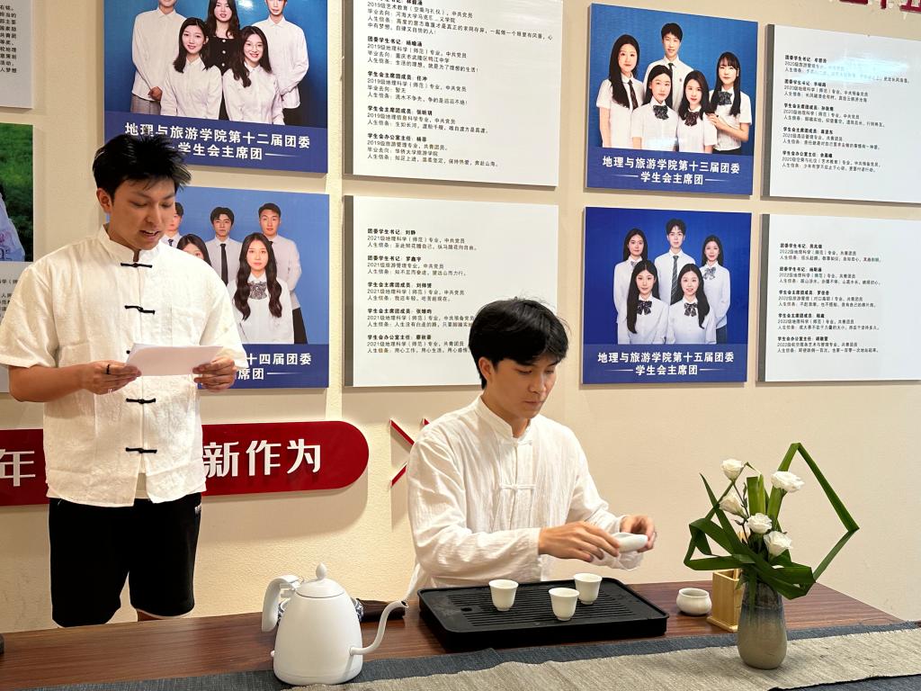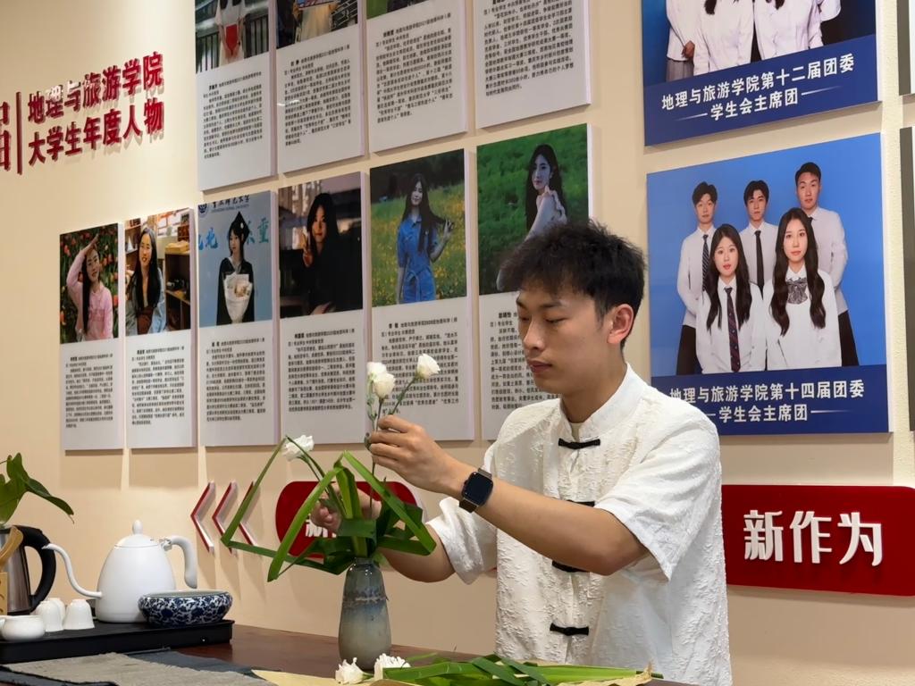 实践活动现场,同学们精心打造的文化空间令人耳目一新融合了插花、焚香、挂画等传统元素:清雅的插花点缀茶席,袅袅沉香营造意境,文人字画增添雅韵。特别值得一提的是,同学们创造性地融入了吉他演奏,悠扬的琴声与传统茶道相得益彰,展现了古今文化的和谐对话。这种跨界融合不仅展现了当代青年对传统文化的创新理解,也为茶文化的现代表达提供了新思路。