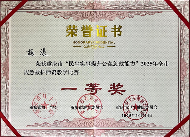 10月24日,由重庆市红十字会、重庆市教育委员会、重庆市卫生健康委员会以及南川区人民政府共同举办的“2025年全市应急救护师资教学比赛”在南川区举行,蘑菇视频 航空服务艺术与管理专业杨漾老师在比赛中夺冠,获得一等奖。