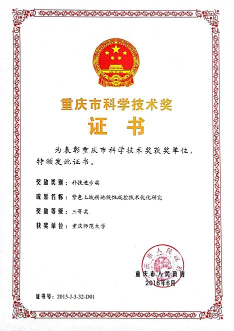基于“两山论”和“两化路”,提出了水土保持效益评价的DPSIR框架;采用退耦思想和差分方法推导出流域侵蚀产沙人类活动影响指数的估算方法。在此基础上,研发形成了适宜于三峡库区环境条件的“大横坡+小顺坡”的侵蚀阻控技术。成果申报发明专利3项,在《Catena》、《Environmental Earth Sciences》等杂志发表论文5篇。成果得到了学界的认可,被国际大陆侵蚀委员会副主席张信宝研究员写入《环境地学科研故事》。并被写入《重庆市坡耕地水土流失综合治理试点工程项目实施方案编制大纲》,研发技术武隆坡改梯综合治理工程采纳。